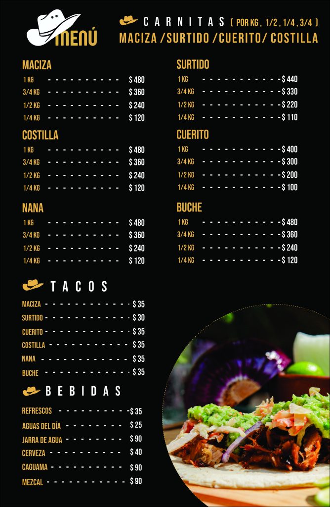 Mira nuestro menú y haz tu pedido con nosotros Incluye: salsa, cebolla morada, ensalada, limones y tortillas
